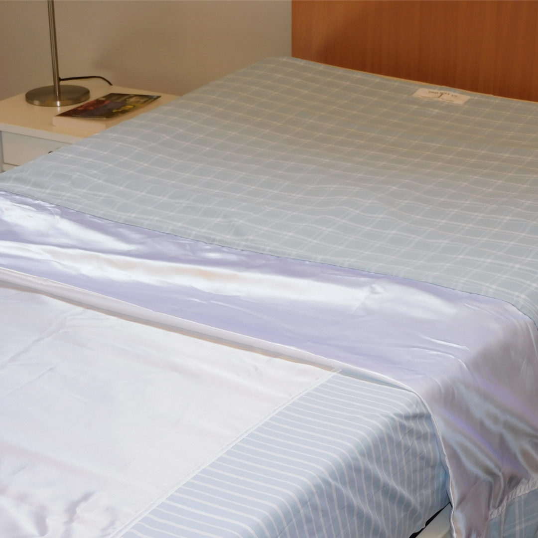Available in two lengths and a variety of widths the design of our SIBA Satin Top Sheets are the same; they all comprise of one piece of a specially woven duck egg blue and white checked polycotton with a satin panel stitched underneath. For the Satin Top Sheet to work and allow for all repositioning around the bed – up and down, turning and sitting – it must be used on top of a Satin Base Sheet as It is the combination of the satin panel of the top sheet working with the satin panel of a base sheet that allows for multi- directional patient positioning. The duck egg blue and white checks denote movement all around the bed in four directions.