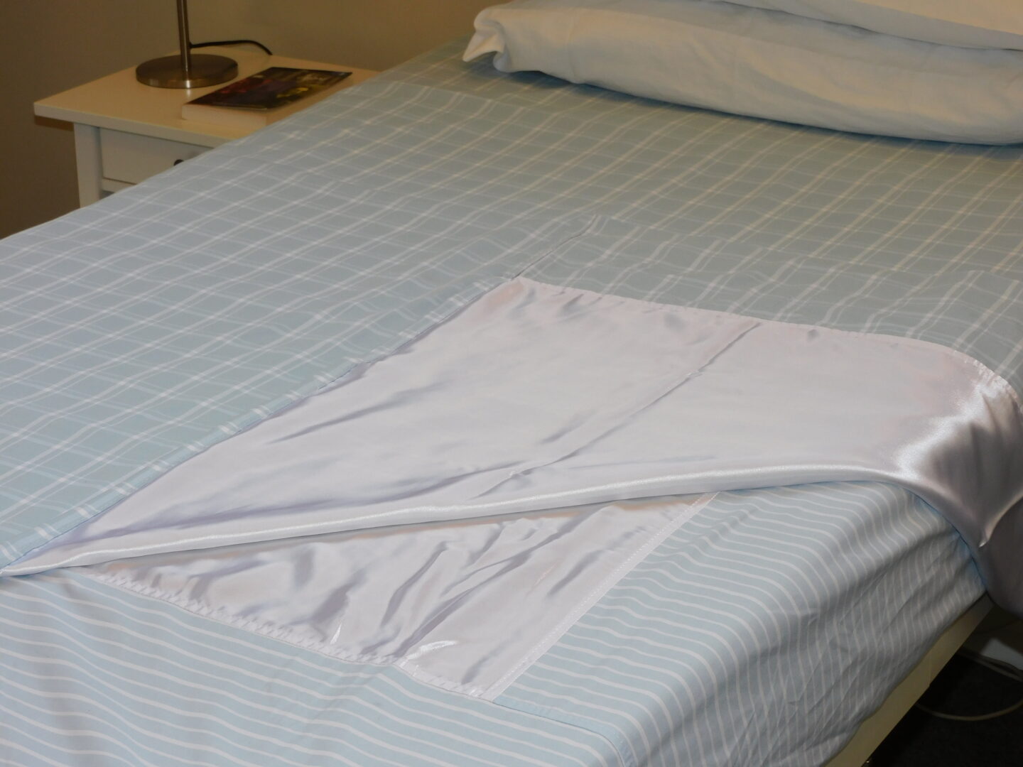 The patient/client lies on the polycotton side of the top sheet, just as they would on a bedsheet. The satin sheets have cotton edges to prevent slippage on the edge of the bed. Once the user is in their desired position, carers can tuck the bottom edge of the SIBA® Satin Top Sheet under itself to prevent further user movement, supine or sitting.